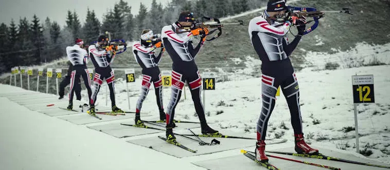 Which Olympic event combines skiing and shooting?